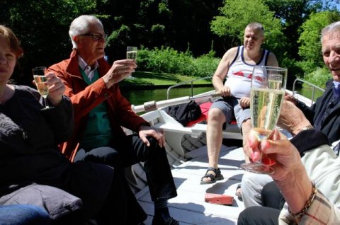 Bådfart med afgang i Frederiksberg have, undervejs nydes et glas champagne.